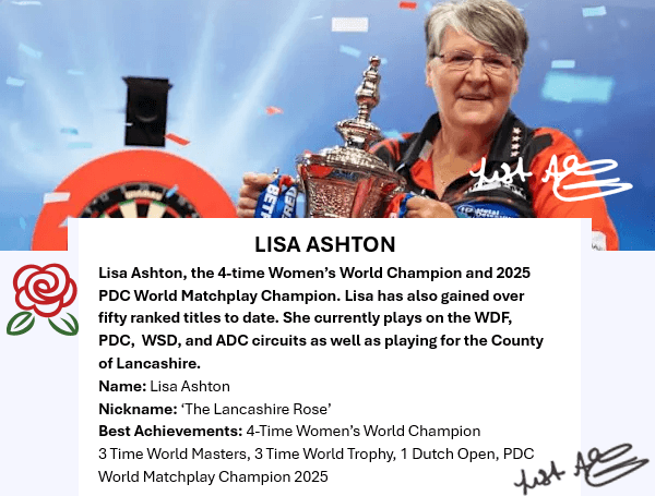 Book 10 Times Ladies World Darts Champion Trina Gulliver MBE and or one of many from the WDF darts circuit. Including the 4 Time Women's World Champions Lisa Ashton, 3 Times World Champion Martin Adams, the 2015 World Champion Scott Mitchell, the ‘Limestone Cowboy’ 1988 World Champion Bob Anderson, or the King of Bling Bobby George. The Owl, Richie Howson, Plus a Master of Ceremonies, Richard Ashdown / Nick Rolls. If there is a player you don’t see listed and would like Trina to contact, please ask.